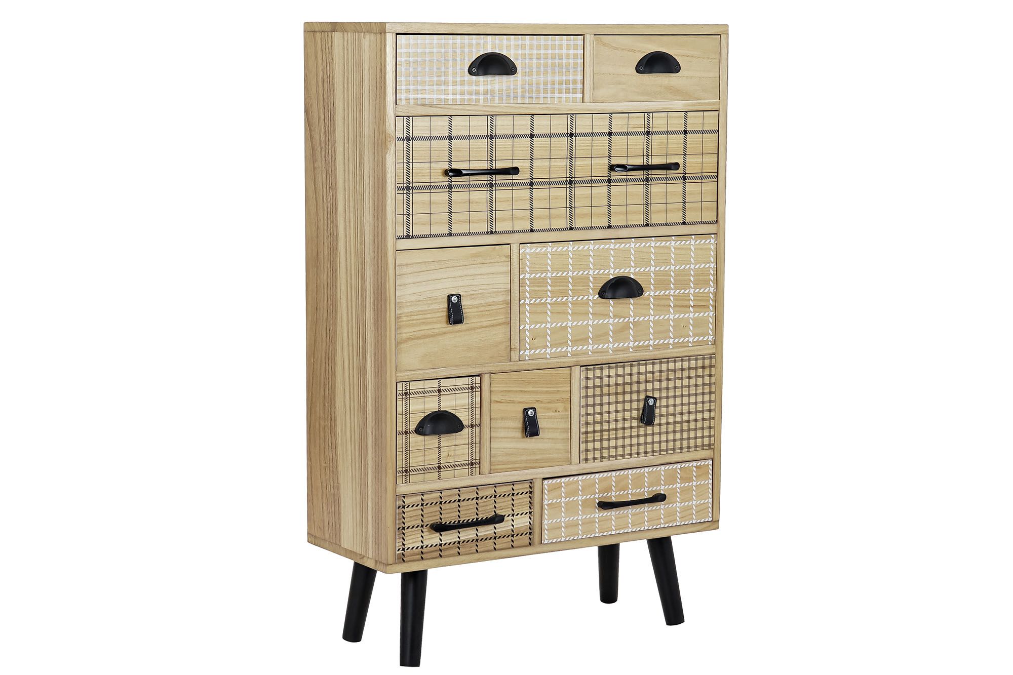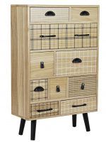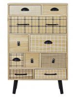 Esta comoda natural cajones con dibujos nórdicos y con esos originales cajones hacen que su diseño sea una maravilla, esta fabricado en madera de MDF con originales tiradores, con diez cajones y patas inclinadas, es bicolor mezclando dos colores que nunca cansan ni pasan de moda como son el natural y los detalles en negro, colores que transmiten calma y tranquilidad, ideal para las habitaciones juveniles, diseño muy actual es un mueble de una personalidad singular, de un aspecto suave a temporal que integrarás perfectamente en cualquier tipo de estilo decorativo, su estilo típico de los muebles nórdicos pero con el toque de los muebles nórdicos que tan en tendencia están, pero este estilo es adaptable a muchos más estilos decorativos como clásicos, alpinos, modernos,….. siempre será un mueble apetecible. A nosotros nos encantan estos muebles tan originales que no te piden cambiarlos nunca, fabricados con un gran diseño. Esta comoda natural cajones será de gran utilidad para guardar las mil cositas, la puedes usar de mueble auxiliara para cualquier estancia de la casa incluso pasillos por ser un mueble estrecho se presta a ello perfectamente. Esta comoda natural cajones es muy fácil de mantener basta le pases una bayeta humedecida en cera especial muebles y quedará como nueva, no es un mueble pesado lo que le hace que lo puedas desplazar con cierta comodidad. Esta comoda natural cajones tiene unas medidas de ancho total de 60 cm por 26 cm de fondo y una alto de 94 cm. Ahora solo te queda pensar donde lo ubicarías seguro que ya tienes el lugar adecuado. Existe el resto de su colección como escritorio y caja juguetera con ruedas, echa un vistazo en muebles auxiliares.