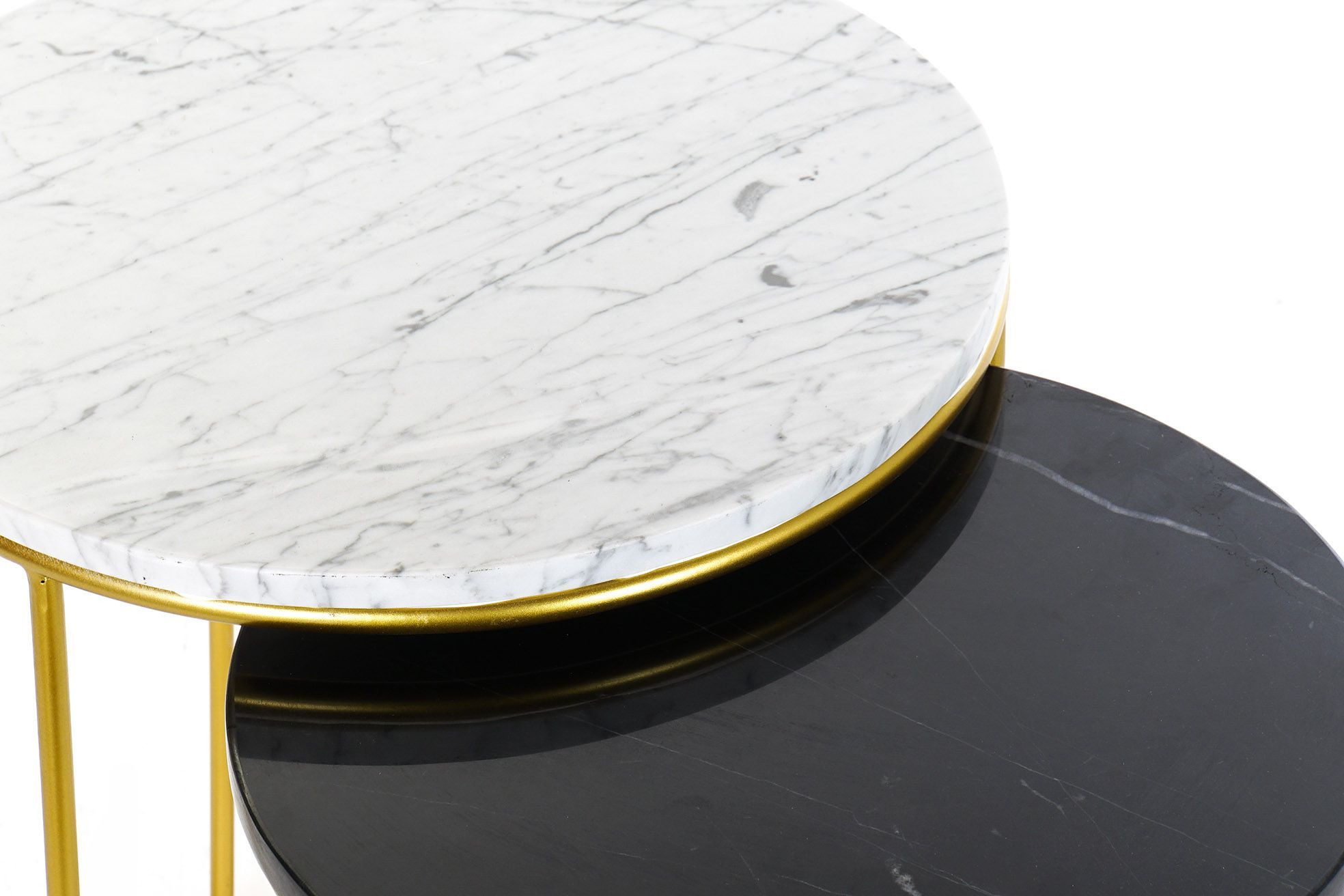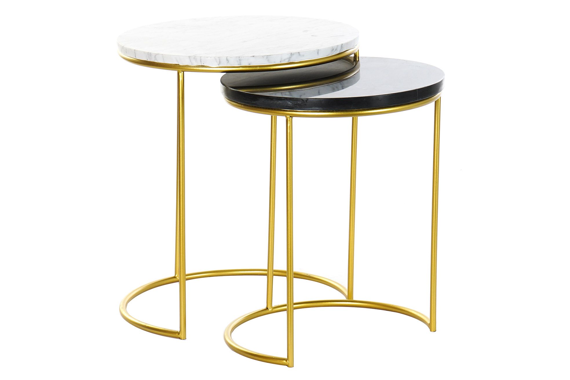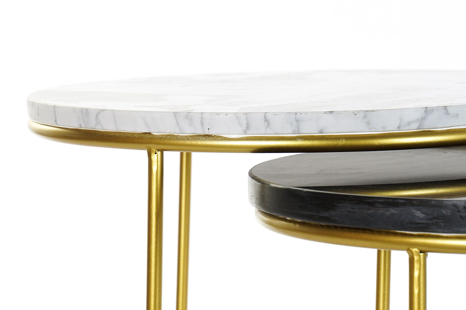 Mesas auxiliares doradas mármol son de diseño contemporáneo de aire chic ideales y con un precio sorprendente, en que salón no es necesario unas mesitas auxiliares? en cualquier rincón o como estás que te servirán de mesas de centro para esas veladas encantadoras alrededor de una mesa con un buen aperitivo que compartir con tu familia y/o amigos. Como nos gustan estas mesas auxiliares doradas marmol suaves con esas formas circulares y con la simetría de las mesas de nido de estilo chic toda fabricada en metal y pintadas en dorado, no pasarán desapercibidas en tu salón por su bonito y original diseño serán unas piezas muy especiales en cualquiera de tus estancias favoritas. Estas mesas auxiliares mármol son fácil de integrar en cualquier estilo decorativo, por su diseño actual son muy aconsejables en decoraciones contemporáneas, de estilo glam tan de moda ahora e incluso en esos apartamentos de aire vintage donde cualquier mezcla queda genial. Combinalas con un sofá de color llamativo brillará la luz en tu salón, no olvides poner encima algún adorno floral en jarrón de cristal transparente con algo verde aportarás movimiento y luminosidad, una bandeja redonda para conservar mejor su superficie a la vez te decorará, unas velas, unas cajitas, cualquier decoración llamará la atención, tampoco es aconsejable por su diseño sobrecargarlas, el tamaño es bastante amplio por lo que te quedará genial como mesa de centro, tiene unas medidas la de tamaño mayor de 40 cm de diámetro y una altura de 47 cm, la mesa más pequeña tiene un ancho total de 35 cm y un alto de 43 cm. Estas mesas auxiliares doradas mármol las puedes adquirir en el pack completo como se presentan en la imagen, no  es posible venderlas por separado. De fácil limpieza bastará que le pases un paño anti polvo con un poco de tu producto neutro de limpieza para muebles en la superficie cualquier limpiador de cristales te servirá.