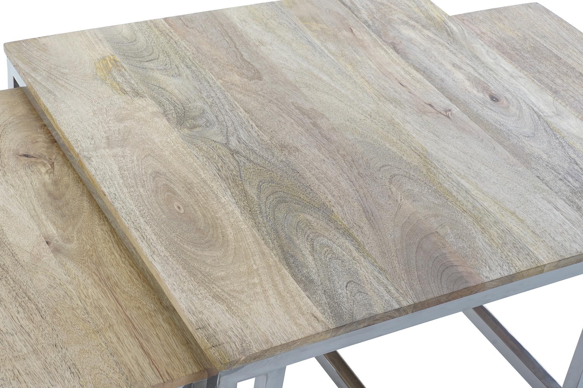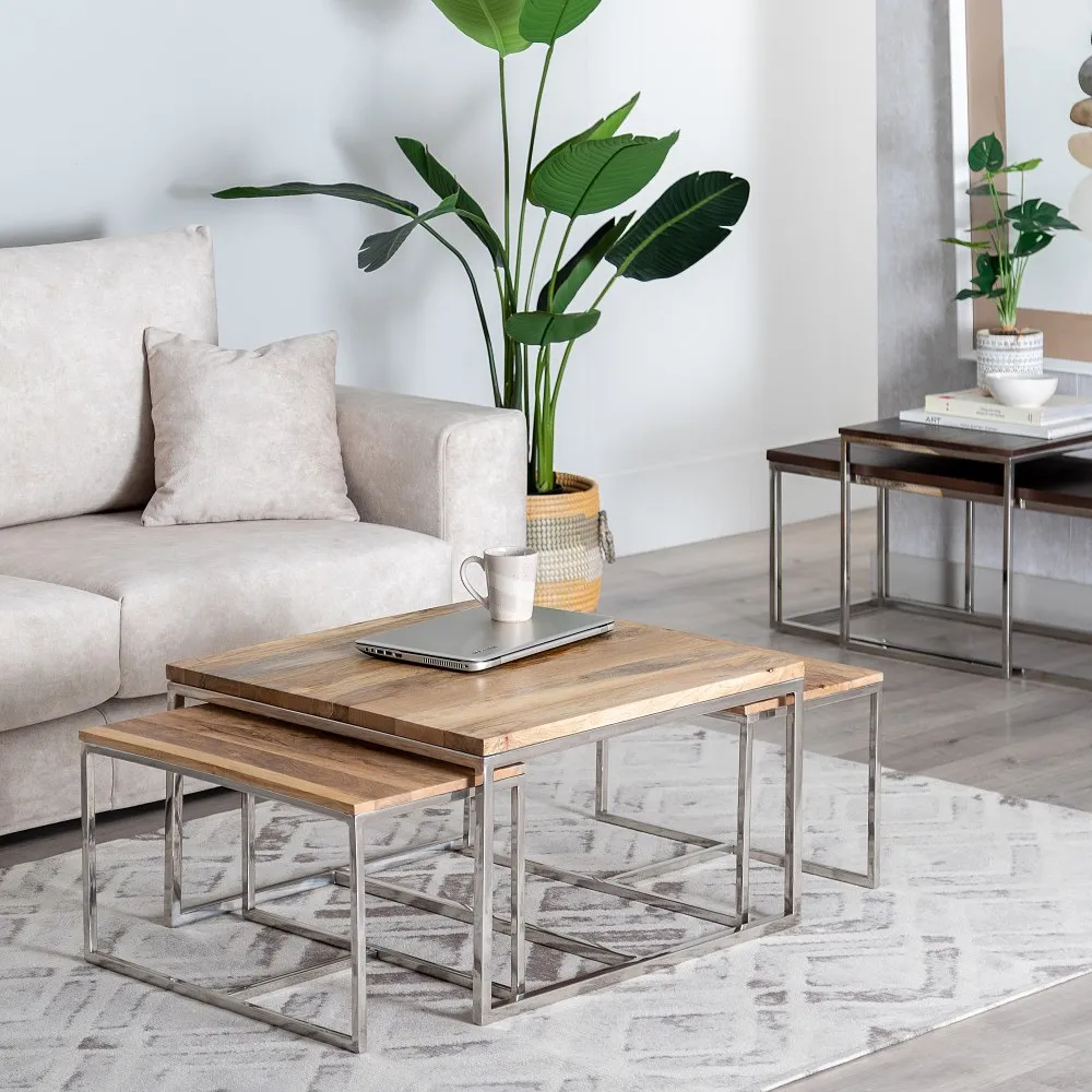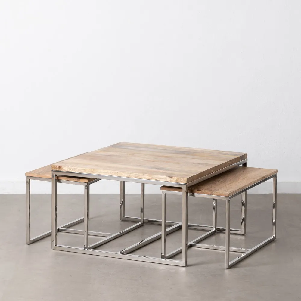 En que salón no es necesario unas mesitas auxiliares? en cualquier rincón o como estás que te servirán de mesas de centro para esas veladas encantadoras alrededor de una mesa con un buen aperitivo que compartir con tu familia y/o amigos. Como nos gustan estas mesas inoxidables suaves con esas formas rectangulares y con labrados en forma de rectángulos toda fabricada en metal inox y las tapas en madera natural de mango teñido en tono madera marrón claro con vetas de la propia madera, con distintas métricas tanto en altura como anchura, estas mesas auxiliares inox no pasarán desapercibidas en tu salón por su bonito y original diseño serán unas piezas muy especiales en cualquiera de tus estancias favoritas. Fácil de integrar en cualquier estilo decorativo, por su diseño actual son muy aconsejables en decoraciones contemporáneas, de estilo chic tan de moda ahora e incluso en esos apartamentos de aire vintage donde cualquier mezcla queda genial.  Combínalas con un sofá de color llamativo brillará la luz en tu salón, no olvides poner encima algún adorno floral bandeja redonda y unas velas. Estas mesas auxiliares inox las puedes adquirir en el pack completo como se presentan en la imagen, no  es posible venderlas por separado. Para el mantenimiento de las mismas por su material metalizado basta le pases una bayeta impregnada en un jabón neutro y quedarán como nuevas. Las puedes combinar las tres juntas o utilizarlas en distintos ambientes por ejemplo dos como centro de mesa y la tercera como mesita auxiliar, tiene mil funciones distintas solo deja volar tu imaginación y sabrás como llenar ese rincón que hace tiempo te pide cambiar.