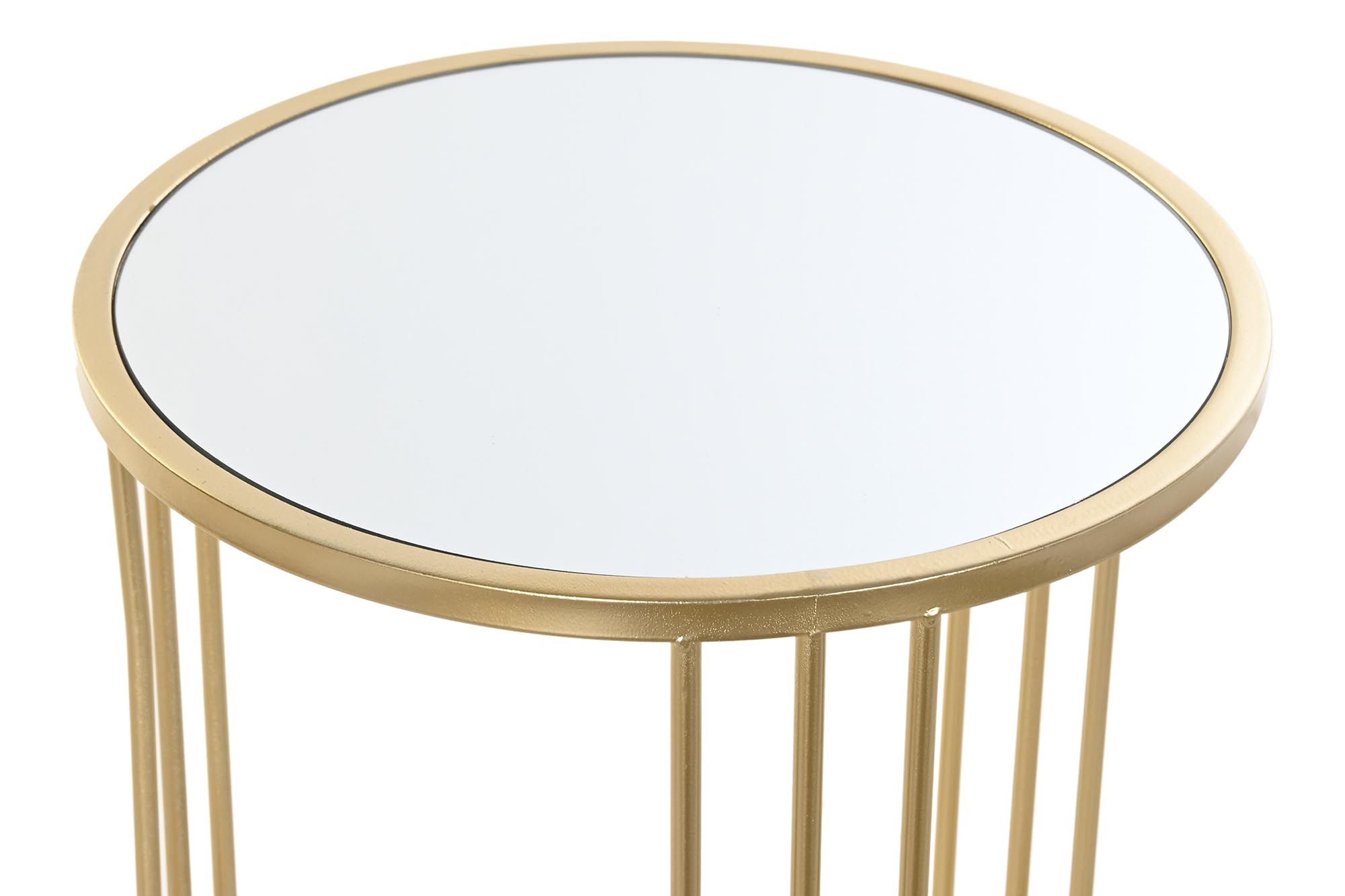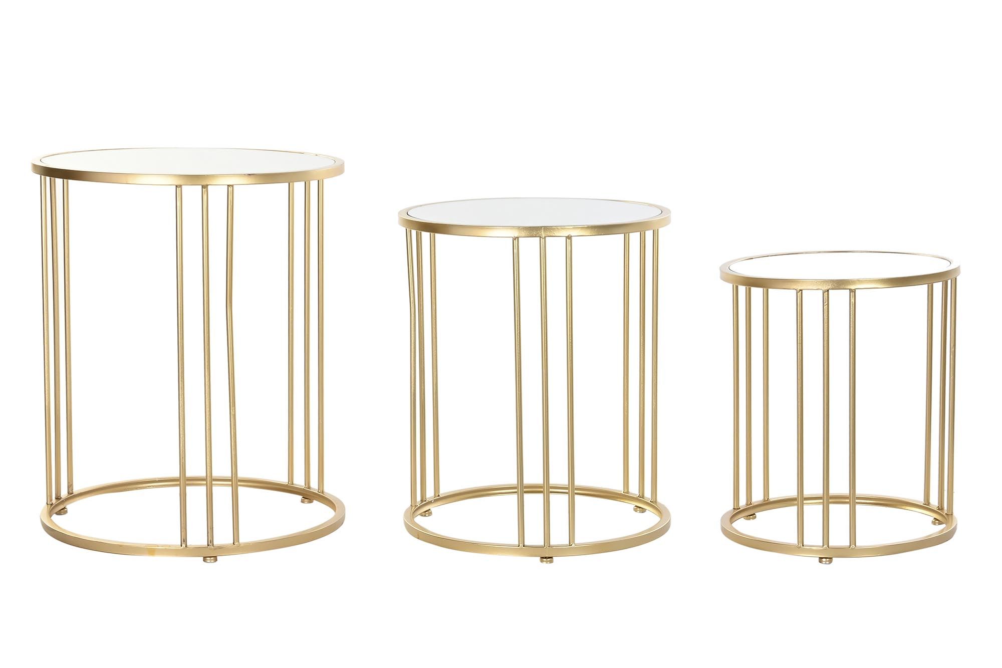 En que salón no es necesario unas mesitas auxiliares? Estas mesas auxiliares redondas doradas chic quedaran genial en cualquier rincón te servirán de mesas de centro para esas veladas encantadoras alrededor de una mesa con un buen aperitivo que compartir con tu familia y/o amigos y como mesas auxiliares para los lados del sofá también son ideales. Como nos gustan estas mesas auxiliares redondas en set 3 con esas formas redondas y las originales patas, su superficie en espejo y de estilo contemporáneo toda fabricada en metal y espejos pintadas en oro brillo, no pasarán desapercibidas en tu salón por su bonito y original diseño serán unas piezas muy especiales en cualquiera de tus estancias favoritas. Fácil de integrar en cualquier estilo decorativo, por su diseño actual son muy aconsejables en decoraciones contemporáneas, de estilo chic, neoyorkino, vintage tan de moda ahora e incluso en esos apartamentos de aire vintage donde cualquier mezcla queda genial. Combínalas con un sofá de color llamativo brillará la luz en tu salón, no olvides poner encima algún adorno floral bandeja redonda y unas velas. Estas mesas auxiliares redondas las puedes adquirir en el pack completo como se presentan en la imagen, no  es posible venderlas por separado. Estas mesas auxiliares redondas son de fácil mantenimiento basta pasar una bayeta anti polvo para la estructura y  con un poco de tu producto de limpiar espejos. Las puedes colocar en forma nido como figura en la última foto si el espacio que tienes es un poco reducido o combinarlas por separado en distintas estancias y funciones, siempre quedarán ideal, ahora seguro que ya sabes donde ubicar estas preciosas mesitas auxiliares espejo.