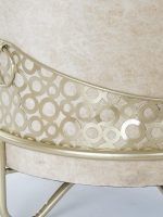 Este Puff tapizado blanco oro en textil de poliester con figuras finas geométricas en tono blanco roto con dorado, esta descalzadora nos remonta a los muebles chic para esos ambientes tan actuales en los que este tipo de muebles son la estrella, por su diseño y color será una pieza que no pasará desapercibida donde quiera que la ubiques.